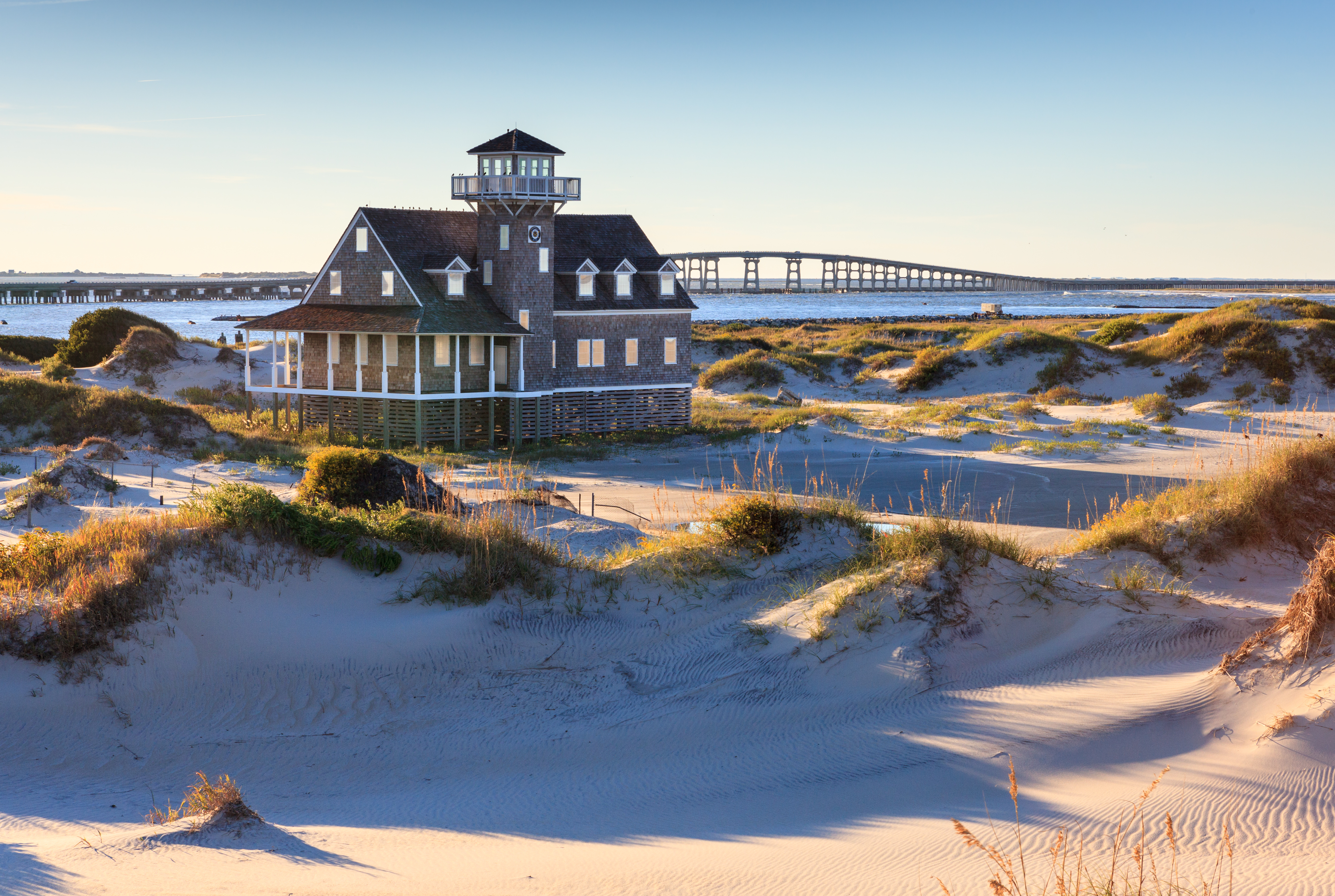 The North Carolina coast stretches for over 480 km and is protected for 320 km by a chain of islands that form a sort of barrier and dotted with picturesque lighthouses. This is still a relatively undeveloped part of the coast, with strips of sand separated from the mainland by narrow channels and connected by bridges and ferries, where even in high season it is still possible to find uncrowded beaches. The main islands in this northern part of the Outer Banks are Bodie, Roanoke, Hatteras, and Ocracoke, where coastal towns with a rich colonial history, old forts, and oceanfront lighthouses can be found. There are also trails for birdwatching enthusiasts and museums related to the area's history, such as the one in Kitty Hawk, where the Wright brothers took their first flight in 1903. Further south, near Wilmington, we find the Crystal Coast, the historic Cape Fear, and the Brunswick Islands.
